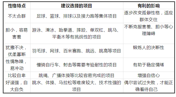 以下是根据不同性格的孩子而制定的建议选择的运动项目表,家长可以参考一下,毕竟选择最适合孩子的形式,有助于他们更长久地坚持。