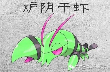 炉阴干虾:甲壳类,长年居住于滇池中,原本通体红色,由于滇池被污染而误食了铜绿等化学物质而变成了屎绿色,以水葫芦为食物。(云南方言中“炉阴干虾”形容很绿,非常绿,相绿!)