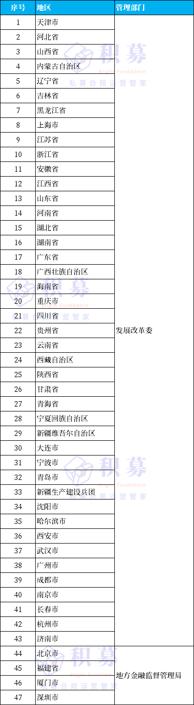 关于省级(含副省级城市)管理部门,有的是地方发改委,有的是地方金融办,不同的地区备案管理部门有所不同,根据国家发改委发布的相关通知可知,各地负责创业投资企业备案的部门分别为: