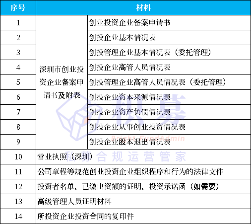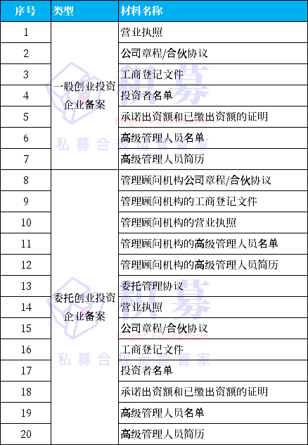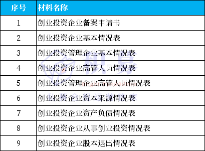 公司章程等规范创业投资企业组织程序和行为的法律文件。 工商登记文件与营业执照的复印件。 投资者名单、承诺出资额和已缴出资额的证明。 高级管理人员名单、简历。