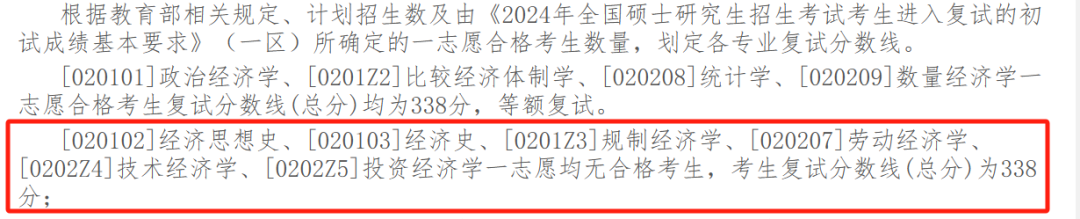 ①经济学院[020102]经济思想史、[020103]经济史、[0201Z3]规制经济学、[020207]劳动经济学、[0202Z4]技术经济学、[0202Z5]投资经济学一志愿均无合格考生,考生复试分数线(总分)为338分。