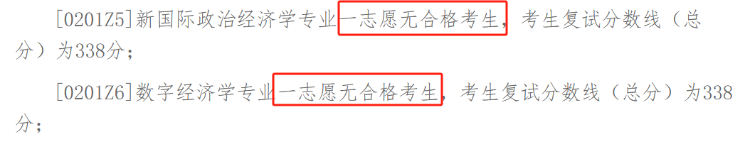 ②国际经济政治学院[0201Z5]新国际政治经济学、[0201Z6]数字经济学专业一志愿无合格考生,考生复试分数线(总分)均为338分;