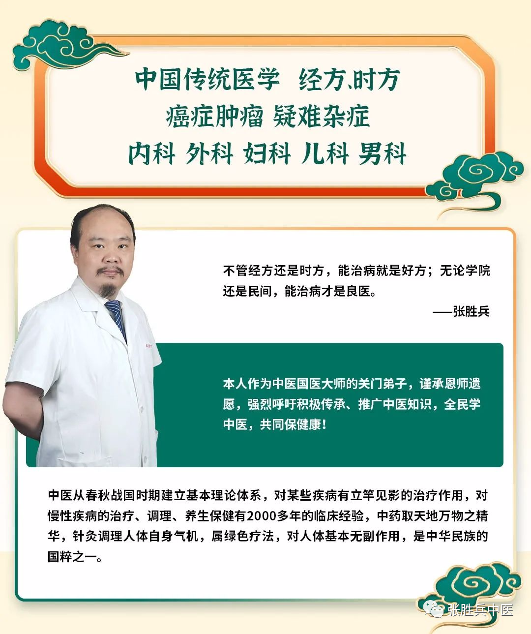 张胜兵,男,汉族,武汉知名中医。籍贯:湖北汉川,号中医鬼谷子,是著名中医学泰斗、国医大师李今庸教授秘传关门弟子(亲笔书信为凭)!是李老晚年寄予厚望的中医未来的希望!为传承其衣钵,其立志要求自己成为“学院与民间共融,经方和时方皆精”的综合性人才!以及能看病,能讲课,能写书,能带徒的“四能”全才!