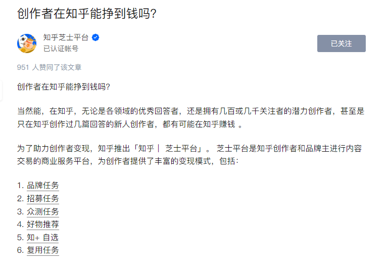 类似“招募任务”,品牌方设置任务,创作者在任务广场选择合适的品牌、问题创作回答,插入知+自选卡片,活动期间,按卡片点击量获得相应费用。