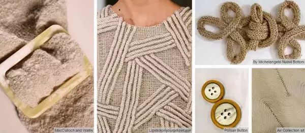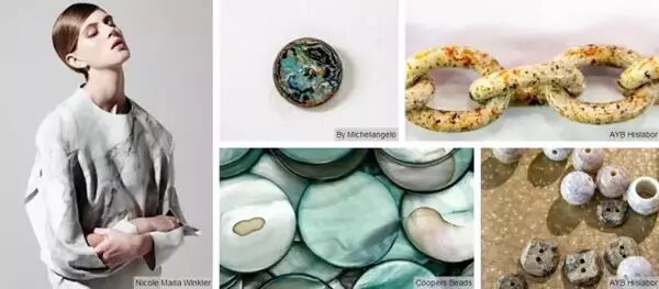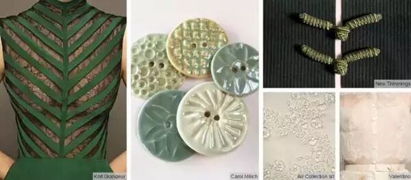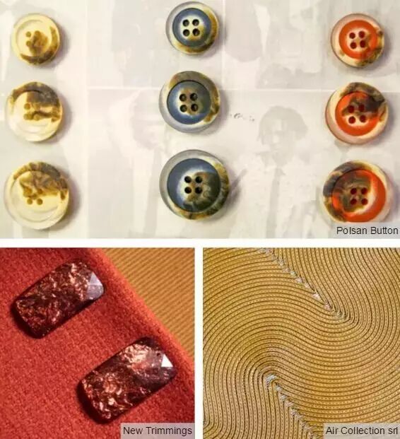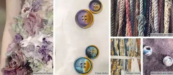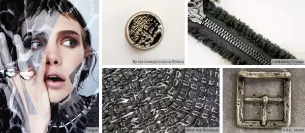 带有天然矿物质感的地质纹理是饰边的核心发展方向。纹状和大理石纹样的表面运用到纽扣、串珠和极薄的亮片中,用于装饰底布,采用非写实的设计手法。斑纹的合成大理石纹样效果模仿了天然成分,采用光亮的表面处理打造出装饰感。