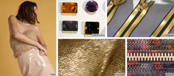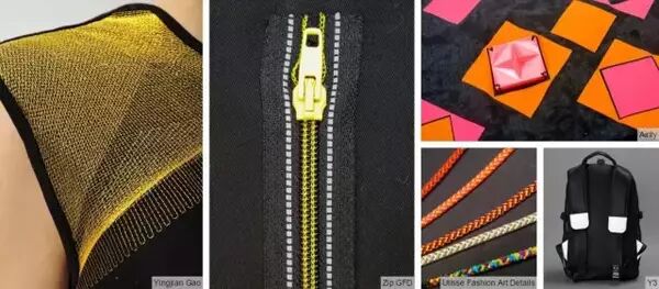 富有光泽的表面和上漆的表面给2017-2018秋冬的饰边和装饰增添了光亮感,十分引人注目。拉链门襟中的漆皮采用光亮的纯色或者混色的光泽材质,涂层亚克力亮片用于更加新颖的廓形中,采用了富有动态感的珠宝色调。完美无瑕的光泽是闪亮反光面料的重点,精致的金色和黑色更加突出这种光亮感。
