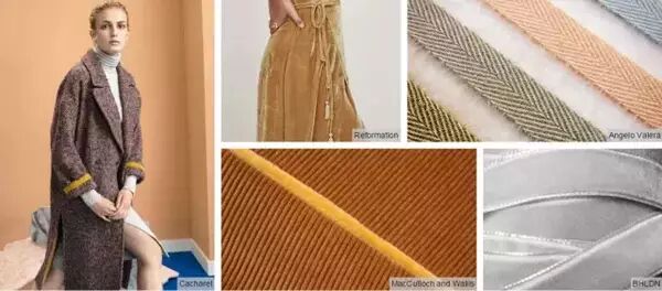 长毛绒和奢华的饰边依旧是冬季的重点,主要采用天鹅绒和棉绒,将其作为绲边或者平带。具有感官的奢华感和触感,70年代芥末色参考奢靡的室内装饰,将精美的图案运用到细凸纹或者V形图案结构中。