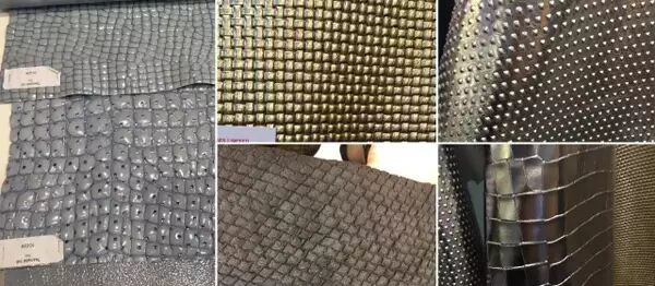 一般选用修面皮或开边珠皮来压制各种花纹或图案而成。比如,仿鳄鱼纹、蜥蜴纹、鸵鸟皮纹、蟒蛇皮纹、水波纹、美观的树皮纹、荔枝纹、仿鹿纹等,还有各种条纹、花格、立体图案或反映各种品牌形象的创意图案等。