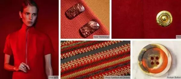 色调强烈的饰边和紧固件演绎出2017-2018秋冬的个性化廓形。编织绳线和陶瓷纽扣上的颜料光泽和刻面珠宝装饰物传递出闪耀的热度,受到了自然界色彩变化的启发。金色的按扣取代了银色,迎合了晚装廓形。