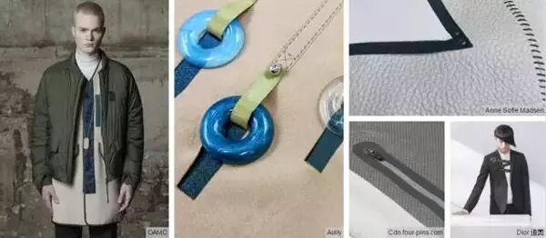 组合式的结构让紧固件更加引人注目,简单的搭配和功能性的加入是重点。实用或者装饰性的露出来的新颖五金件用于男装设计中,采用对比色调,搭扣或者饰钉固定在一起。装饰性的缝线和针迹让功能性设计焕发新意。